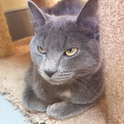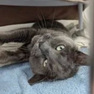 His body was infested with fleas and flea eggs, but he received treatment to eradicate the parasites. In addition, Cinder’s fur was severely matted which made it painful for him to walk. Now groomed, he gracefully parades around the room. flawlessly showing off his grey coat. FULL of personality, Cinder is curious and playful. He is a cuddler, and enjoys as much attention as you can give him. Cinder is quite agile and watching him climb cat towers is quite amusing. He also enjoys pawing at his water bowl. The Veterinarian examined Cinder and noted that a few teeth extractions and dental cleaning would be required. Cinder’s ability to eat was affected and our dedicated staff ensured he received proper nutrition daily with scheduled syringe feedings, supplements, pain medication and antibiotics. Thank you for helping Cinder!